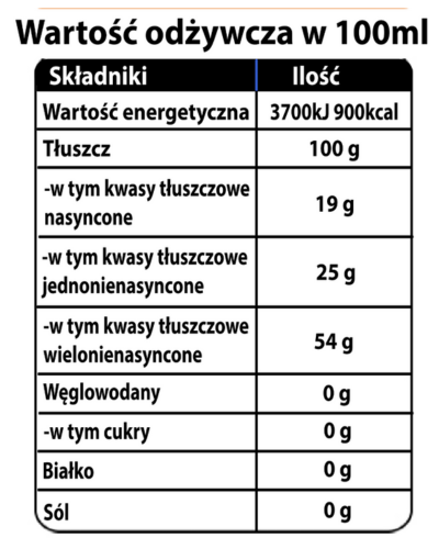 Przechowuj olej w chłodnym, suchym i ciemnym miejscu. Po otwarciu trzymaj w lodówce i spożyj w ciągu 4 tygodni.e.