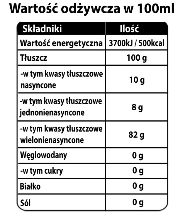 - Zaleca się spożywanie 1–2 łyżeczek dziennie (maks. 10 ml), aby dostarczyć organizmowi cennych kwasów tłuszczowych.